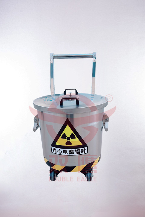 客戶特殊定制放射廢物儲存桶。直徑、高度均為400毫米。鉛當量4mmpb。 產品底部配4個腳輪,一側加推桿車,移動方便。小蓋便于隨時投放廢物放進桶內。大蓋用于廢物塑料袋和廢物一起倒掉。放射廢物儲存桶,讓危害無處可逃。